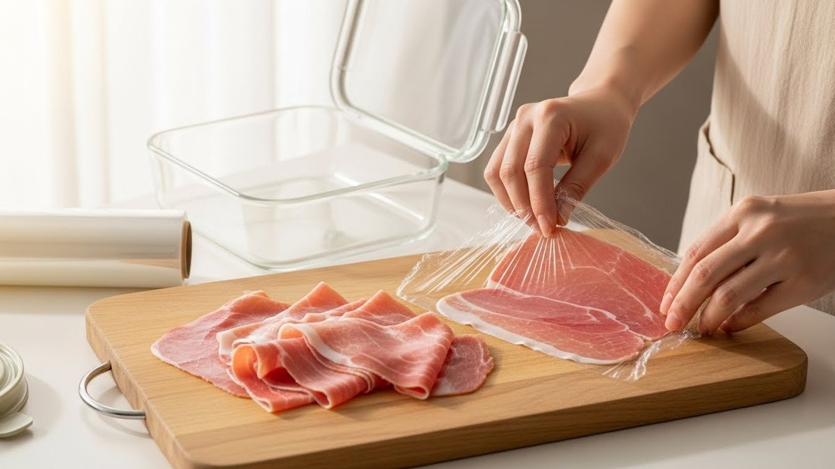 ラップで包んだ後は、さらにそれをジップ付きの保存袋や、密閉性の高いタッパーなどの保存容器に入れる「二重ガード」がおすすめです。冷蔵庫内は意外と乾燥しており、ラップだけでは防ぎきれない水分蒸発を保存容器が防いでくれます。また、生ハムは他の食品の匂いを吸着しやすい性質があるため、二重に密着させることで、冷蔵庫特有の生活臭が移るのを防ぎ、風味を損なわず保存できます。