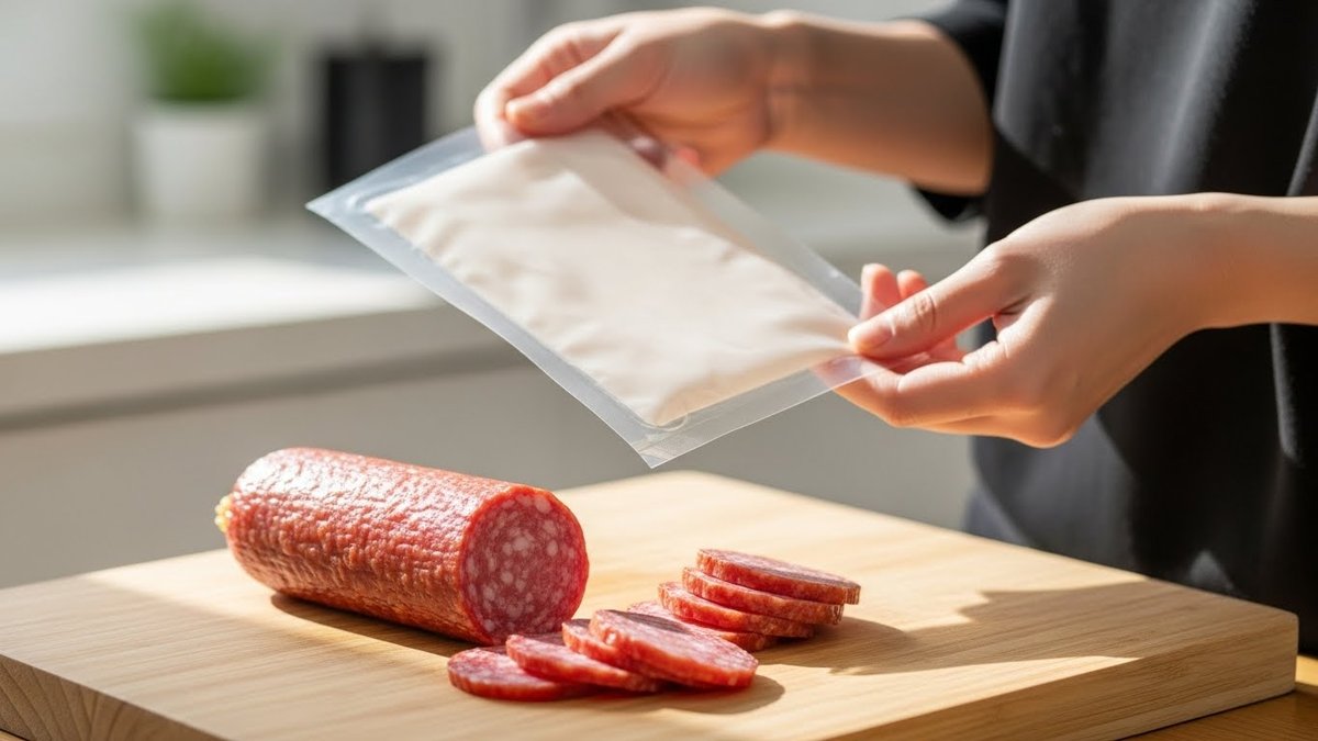 サラミを一度に使い切れない場合は、保存方法を一工夫するだけで、その後の劣化を劇的に遅らせることができます。基本は「空気に触れさせないこと」です。元のパッケージのまま口を閉じるだけでは不十分ですので、ラップを使って1回分ずつ、または数枚ずつ重ならないようにピッチリと包みましょう。その上で、ジッパー付きの保存袋に入れ、空気を押し出しながら閉じてから冷蔵庫のチルド室へ入れます。