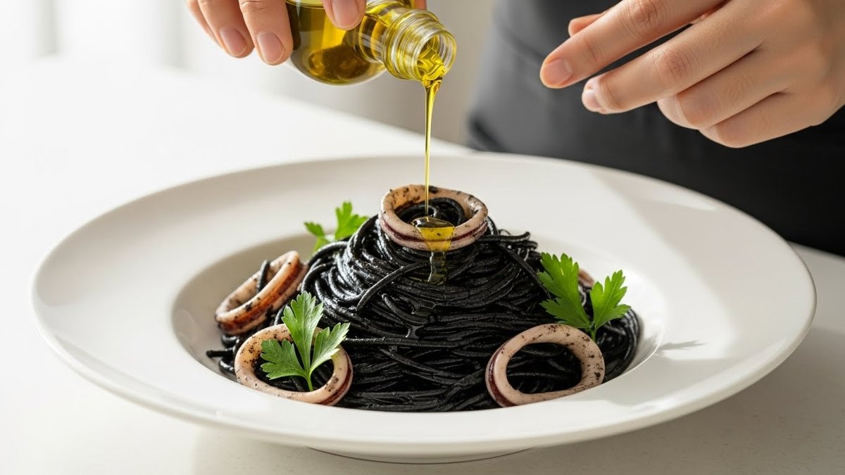 イカ墨そのものには強い旨みがありますが、それ単体では少し「角」のある味になりがちです。この旨みを円やかにし、ソースとして一体感を持たせるのが「魚介の出汁」と「上質な油」です。調理の際、イカの身だけでなく、あさりやエビなどの魚介類を一緒に使うことで、重層的な旨みが生まれます。また、オリーブオイルをたっぷり使うことで、油分が墨を乳化させ、パスタに絡みやすい滑らかな質感を作り出してくれます。